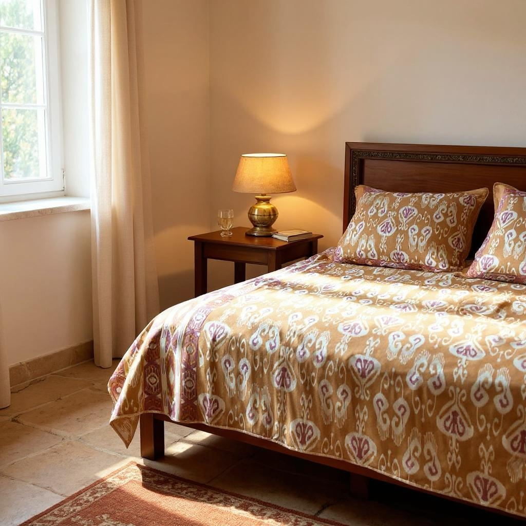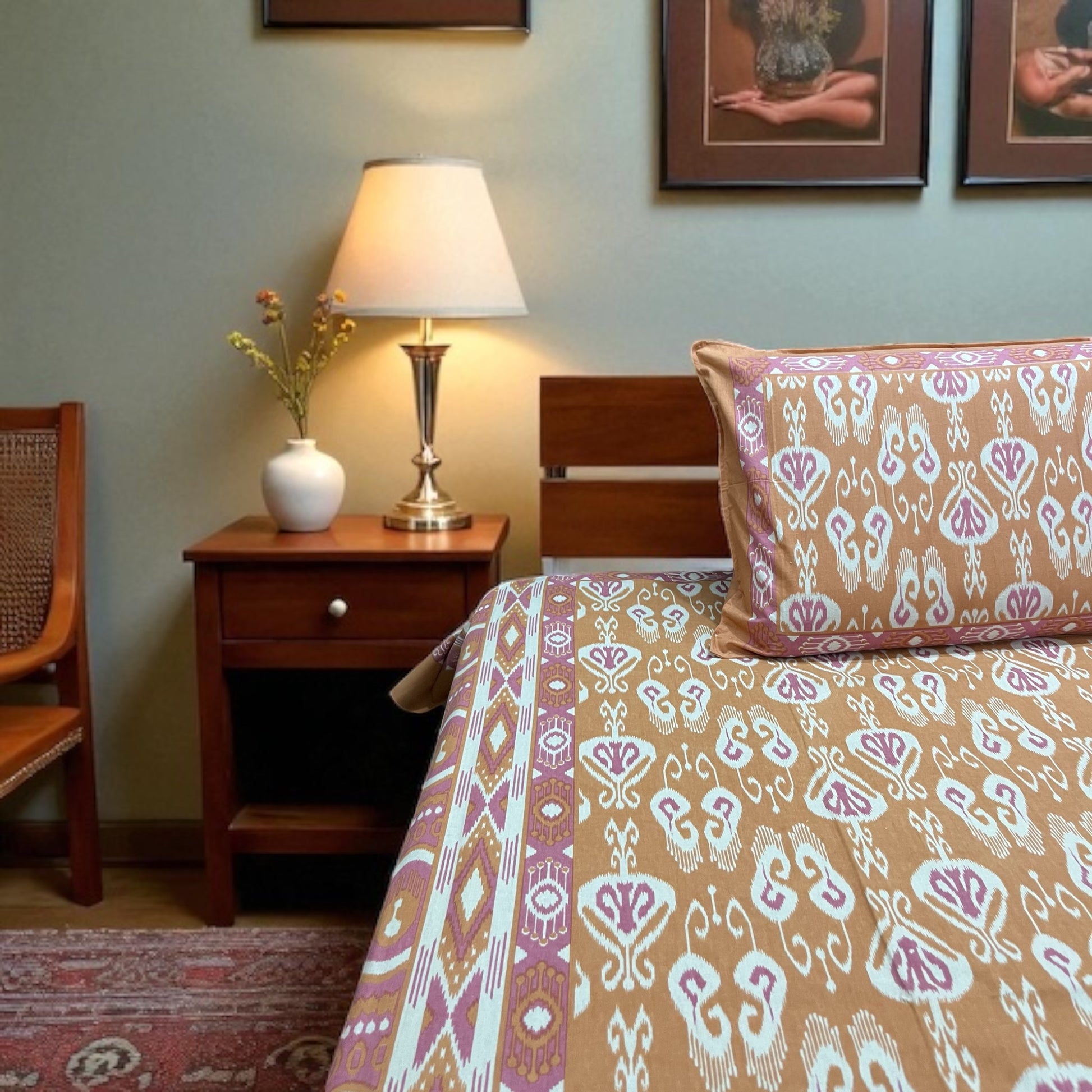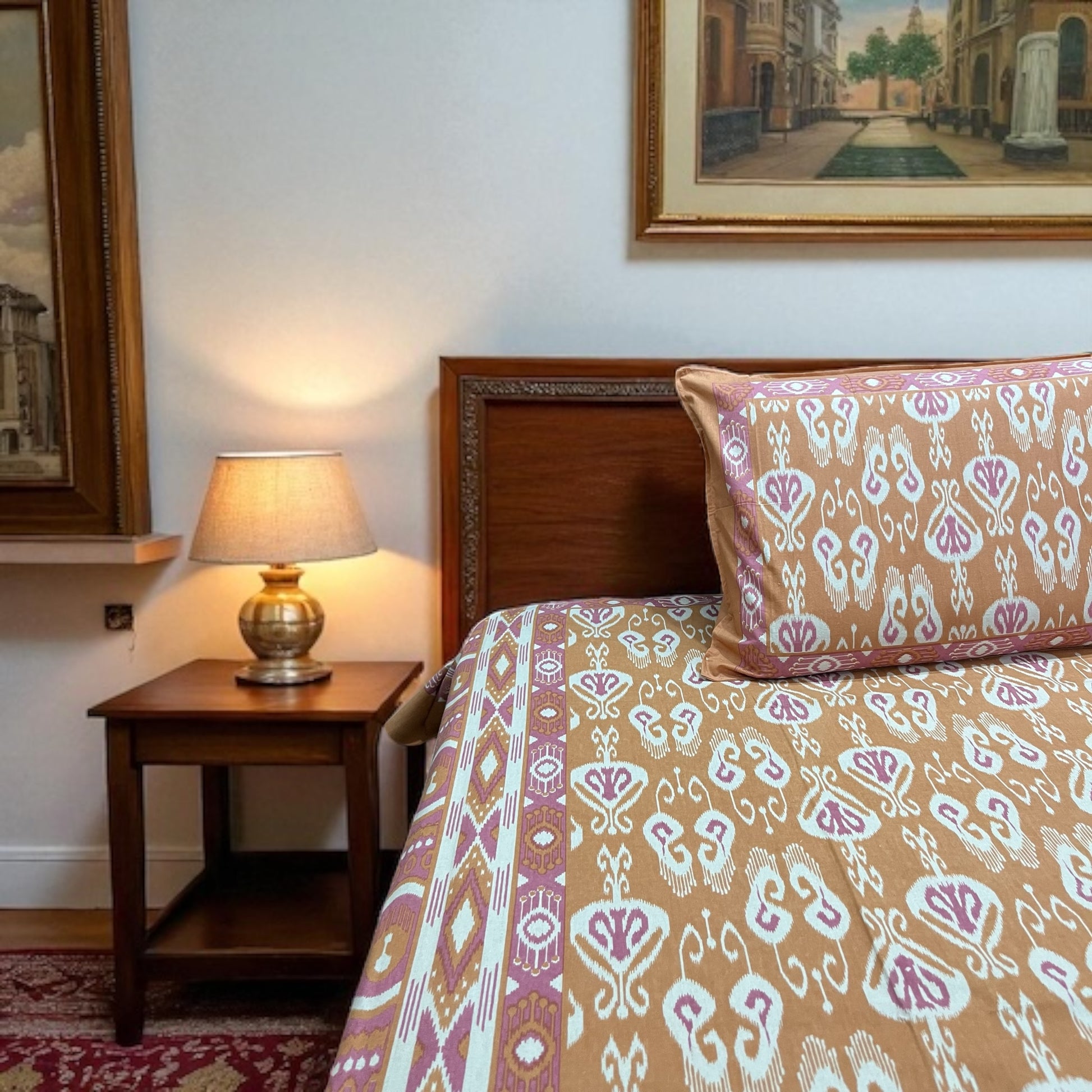 Bring warmth and elegance to your bedroom with our Amber Dusk Pure Cotton Bedsheet Set, designed to create a cozy, sophisticated look. Featuring intricate ikat-inspired motifs in soft amber and mauve tones, this bedsheet blends traditional charm with modern appeal.