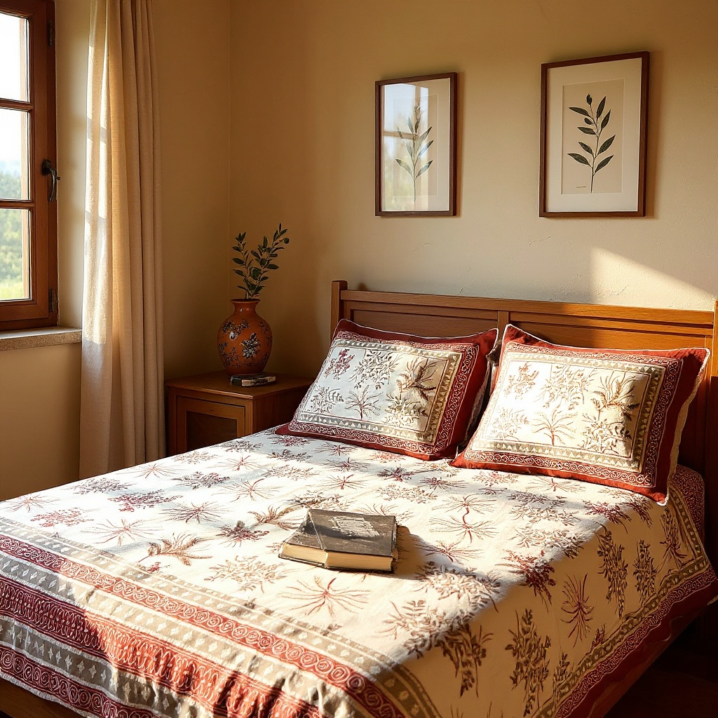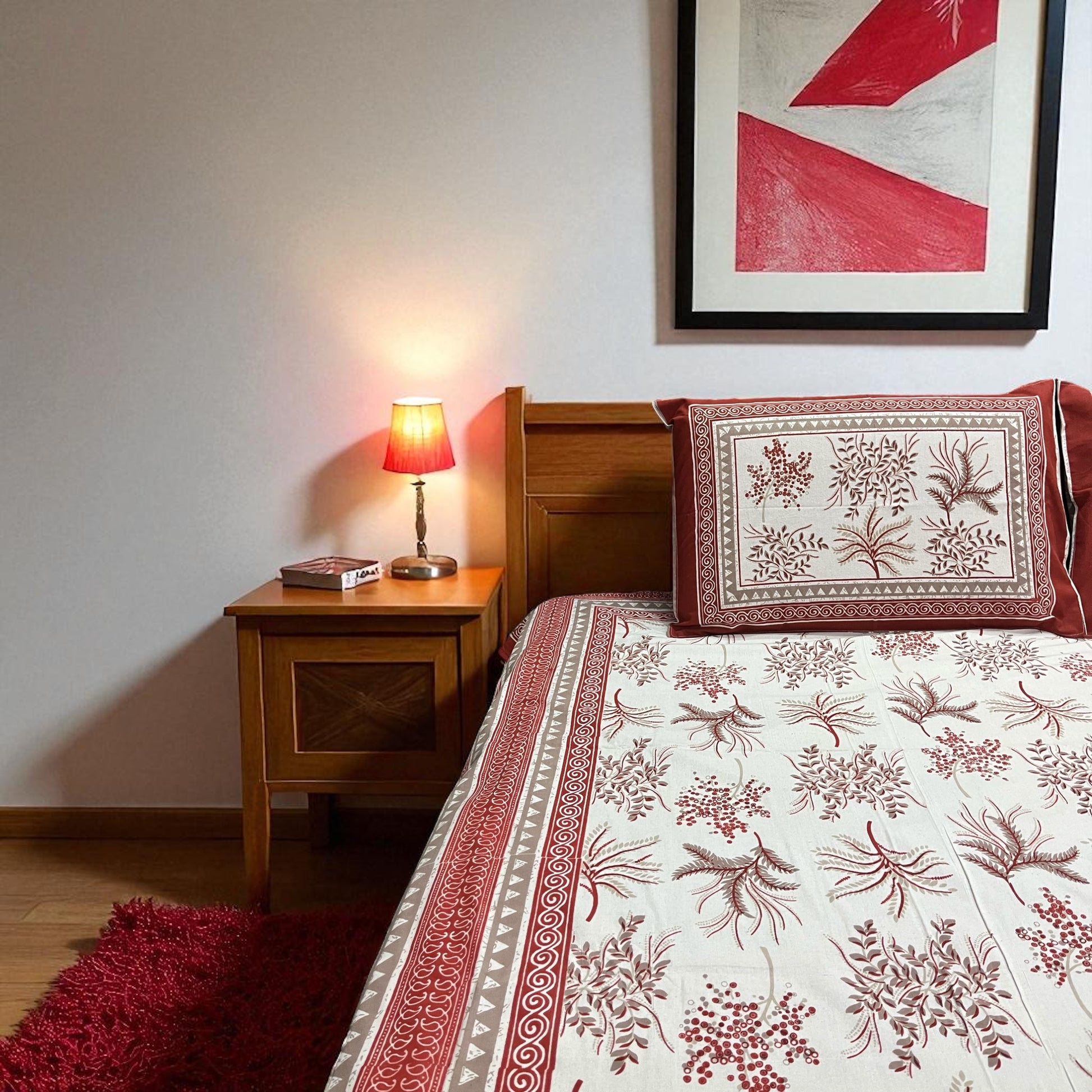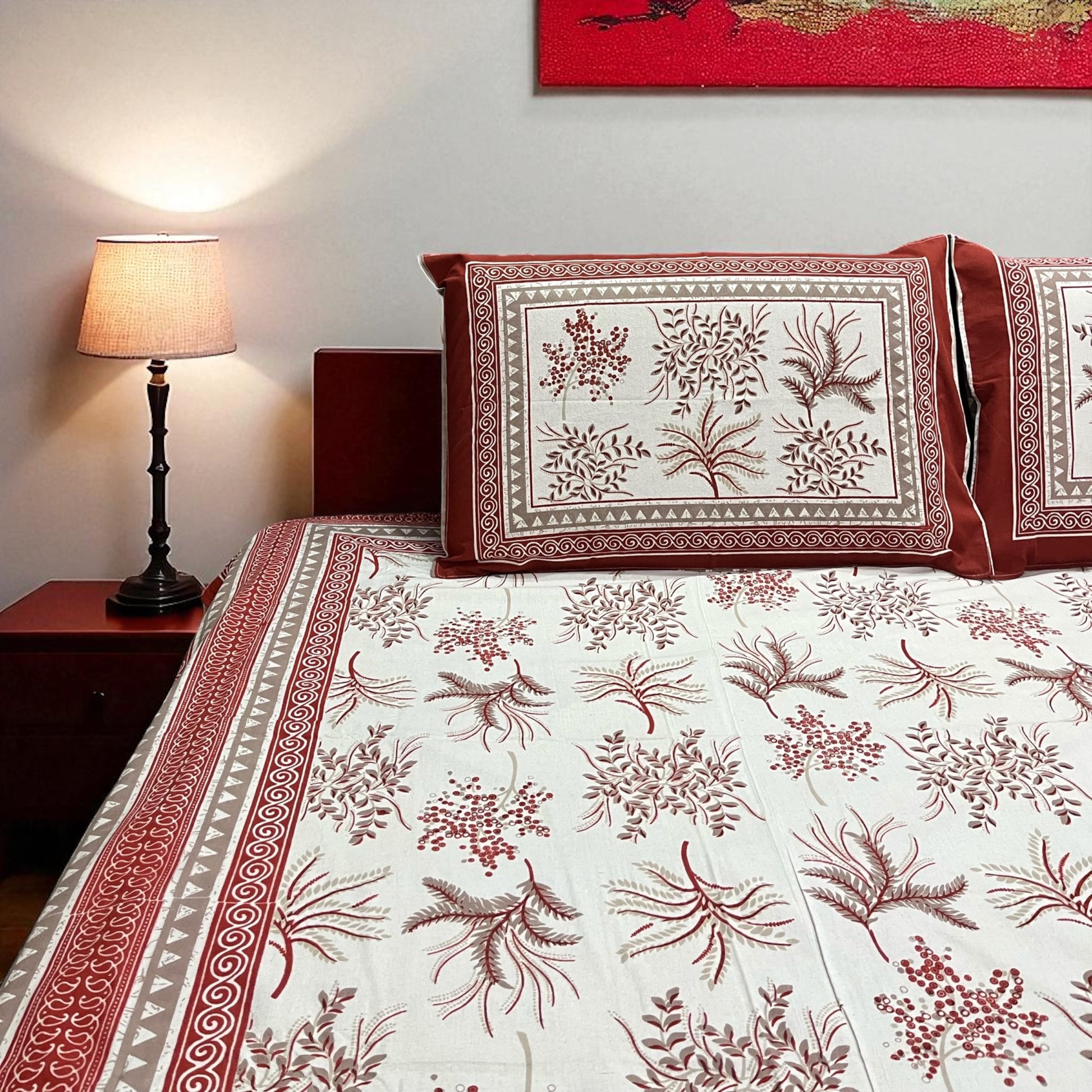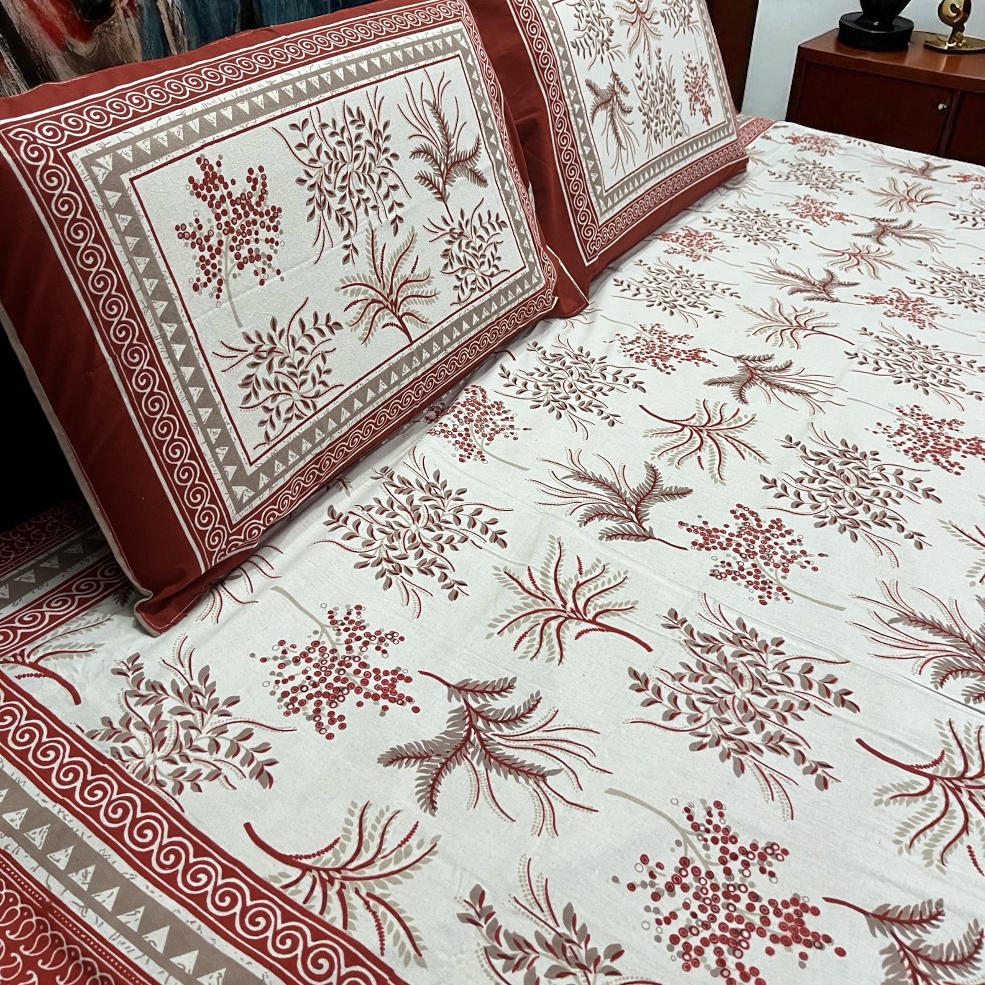 Celebrate timeless elegance with our Heritage Rust Bedsheet Set, designed with intricate floral sprigs and traditional borders in warm rust-red tones. Inspired by classic handblock artistry, this bedsheet brings heritage charm into modern homes while offering the comfort of soft, breathable cotton.