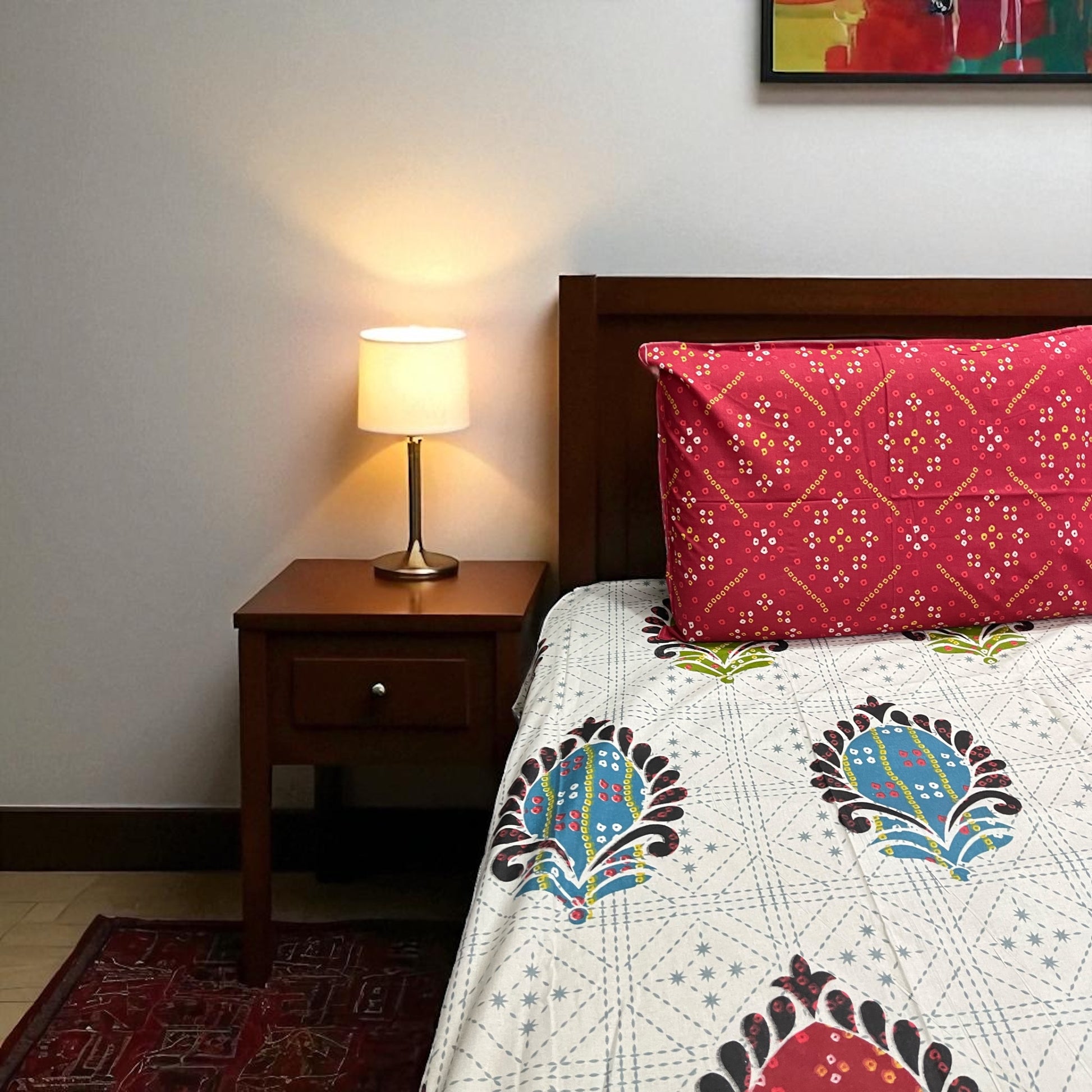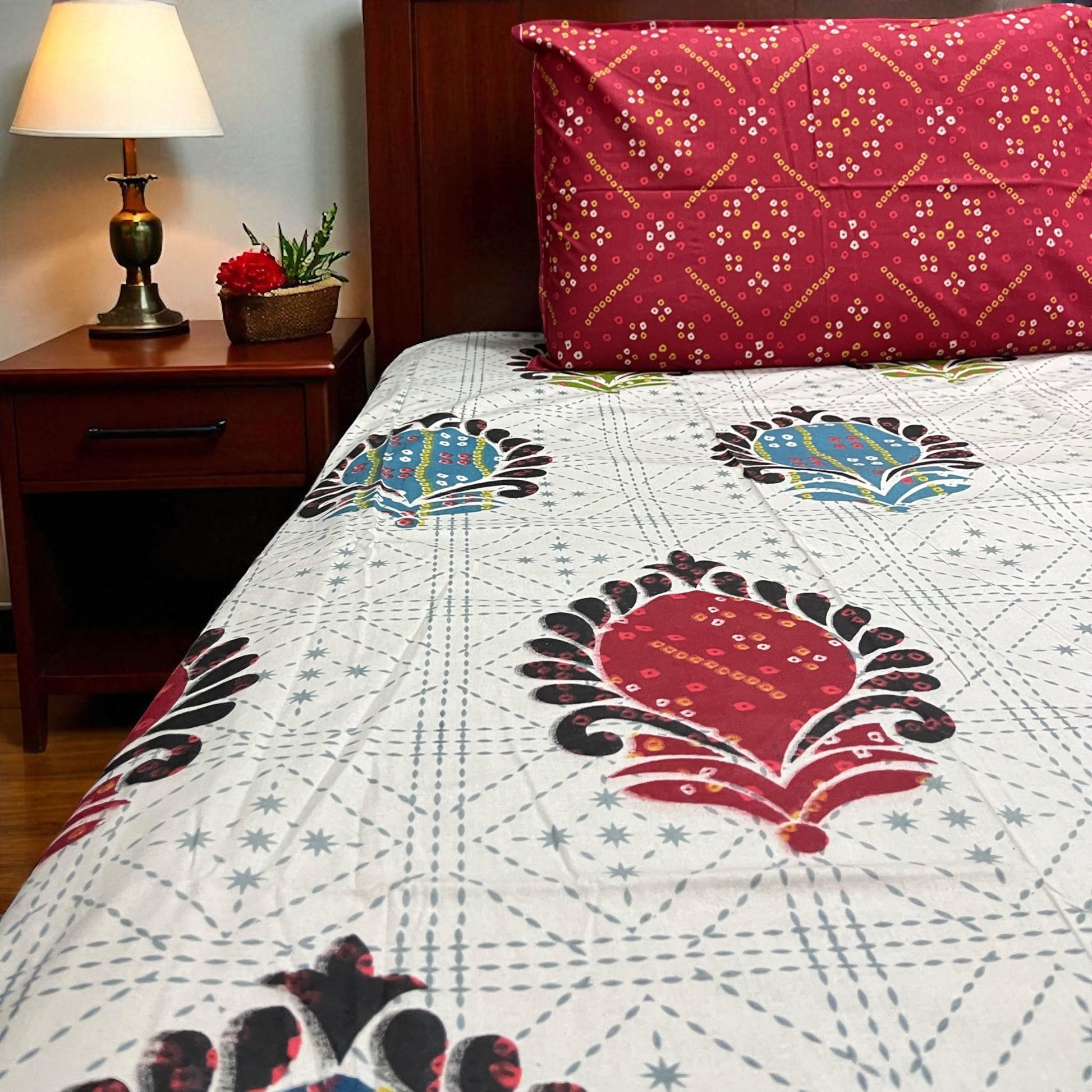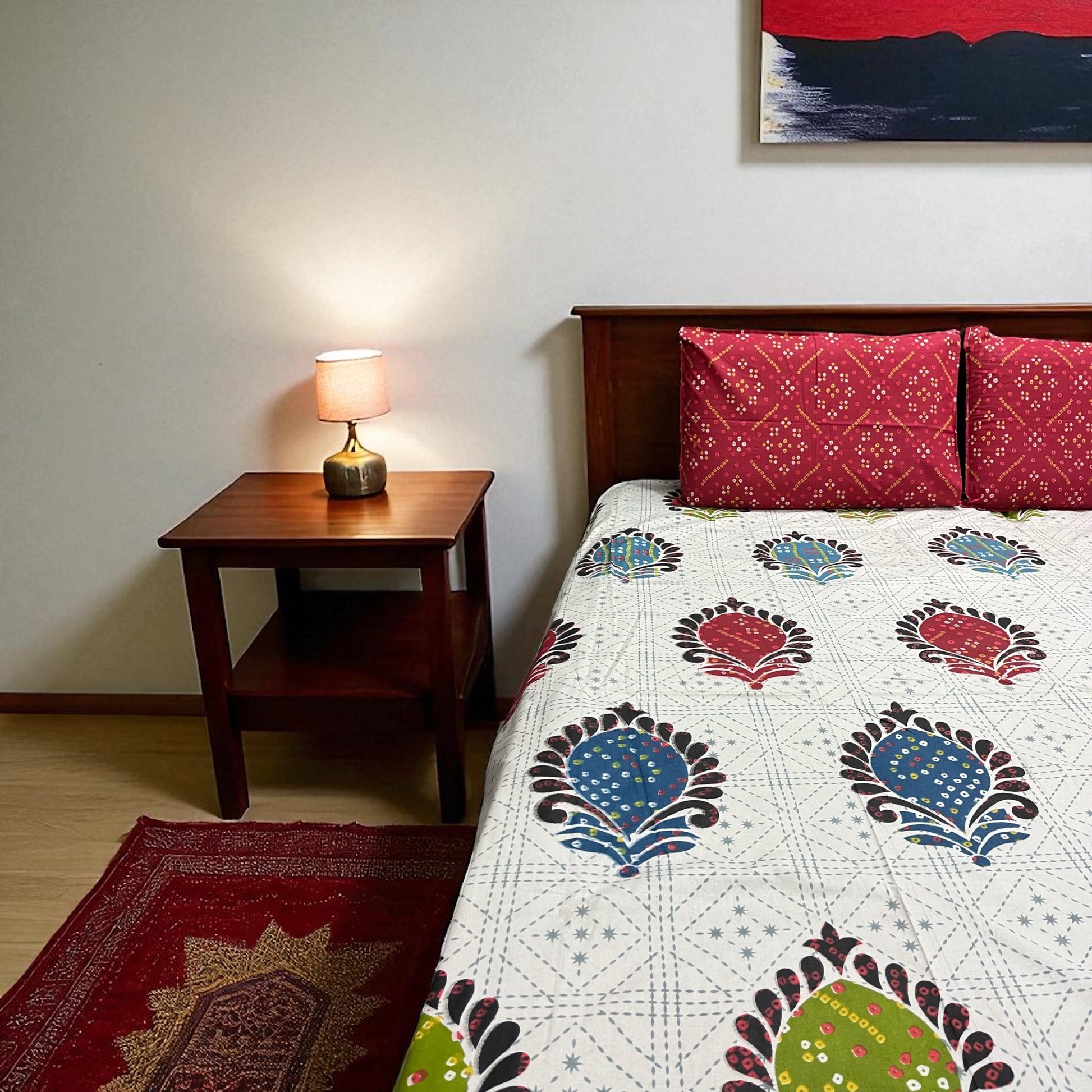 Bring timeless elegance to your bedroom with our Royal Crimson bedsheet, featuring bold crimson florals paired with vibrant blue and green accents on a soft white base. Crafted from 100% premium cotton, this design blends traditional block-inspired motifs with modern sophistication. The rich red pillow covers add a regal touch, making this set a perfect choice for festive occasions, wedding gifting, or everyday luxury.